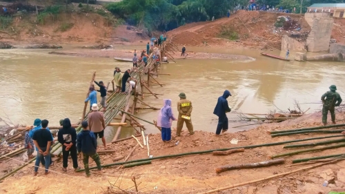 Sau cơn bão số 10, cầu Trung Thắng, xã Yên Hoà bị cuốn trôi, hơn 300 hộ dân với hàng nghìn nhân khẩu rơi vào cảnh bị chia cắt. Chính quyền phải huy động các lực lượng chức năng và người dân làm cầu tre để lưu thông. Ảnh: ĐT |