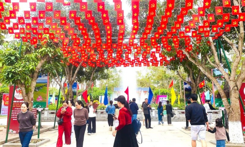 Khu di tích Quốc gia đặc biệt Kim Liên đã sớm trang trí cờ hoa, pano, áp phích chào mừng Đại hội lần thứ XIV của Đảng. Đông đảo du khách về thăm quê Bác trong những ngày đầu năm đã chụp ảnh lưu niệm trong không gian vui tươi, rực rỡ. Ảnh: Mai Liễu |