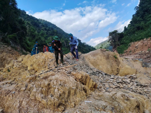 Do các tuyến đường bị cắt đứt máy móc khó tiếp cận nên việc mở lại đường chủ yếu làm thủ công bằng sức người. |