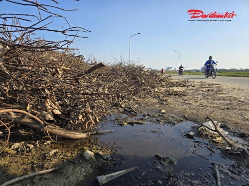 Trước đó, UBND phường Vinh Hưng đã yêu cầu công ty vận chuyển toàn bộ cành, lá cây ra khỏi đường D3 trước ngày 20/9/2025, nhưng đến nay vẫn chưa hoàn thành. Công ty cho biết lượng cành, lá cây khô chưa vận chuyển kịp vì dễ gây cháy, đồng thời đang xin ý kiến tỉnh để thực hiện phương án xử lý. Các bên thống nhất sẽ tận thu rác gỗ cây làm chất đốt, số còn lại sẽ được xúc đi xử lý theo quy định. Hàng ngày, Công ty vẫn phân công xe rác mang các loại rác đã phân hủy đi xử lý. Ảnh: ĐB |