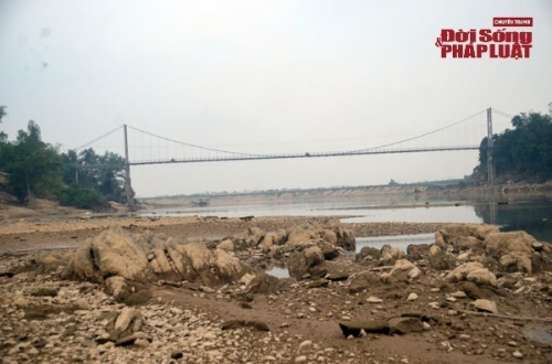Phía dưới chân cầu treo Đò Rô lòng sông Con đã cạn trơ đáy, lộ ra nhiều bãi đá ngầm |