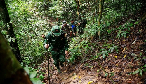 Bộ đội Biên phòng Nghệ An phối hợp Bộ Chỉ huy Quân sự tỉnh Hủa Phăn (Lào) tổ chức tuần tra song phương cấp tỉnh lần đầu tiên trên đoạn biên giới từ mốc 363 đến mốc 365. (Ảnh: Hải Thượng). |