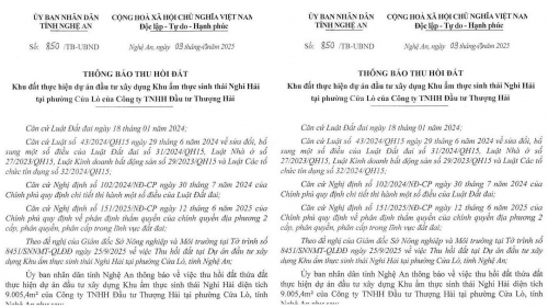 Ngày 25/9/2025, Sở Nông nghiệp và Môi trường Nghệ An có Tờ trình số 8451/SNNMT-QLĐĐ đề nghị thu hồi đất của dự án. Trên cơ sở đó, căn cứ Luật Đất đai 2024, Nghị định 102/2024/NĐ-CP và Nghị định 151/2025/NĐ-CP, UBND tỉnh Nghệ An chính thức ban hành Thông báo thu hồi toàn bộ khu đất 9.005,4m² của Công ty TNHH Đầu tư Thượng Hải tại phường Cửa Lò.