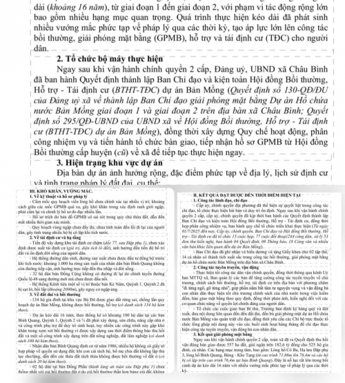 Những vướng mắc trong công tác bồi thường, GPMB và tái định cư tại Dự án hồ chứa nước Bản Mồng bắt nguồn từ nguyên nhân dự án kéo dài. Để thực hiện đúng quy định, đảm bảo quyền lợi chính đáng cho người dân, đẩy nhanh tiến độ dự án, rất cần sự vào cuộc quyết liệt, đồng bộ của các cấp, ngành trong việc tháo gỡ vướng mắc, ổn định đời sống cho các hộ dân bị ảnh hưởng.
