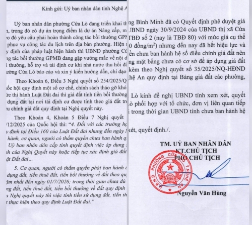 Những vướng mắc liên quan đến quyền lợi và phương án bồi thường đã khiến việc giải phóng mặt bằng kéo dài từ năm 2022 đến nay, làm chậm tiến độ hoàn thiện toàn tuyến. Trước tình hình trên, UBND phường Cửa Lò đã đề xuất các cơ quan chức năng cho chủ trương thu hồi toàn bộ diện tích đất của ba hộ dân để giải quyết dứt điểm vướng mắc trong công tác bồi thường và hỗ trợ tái định cư.