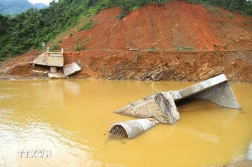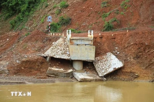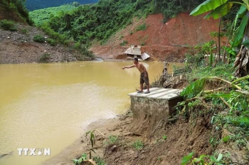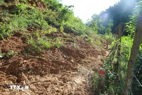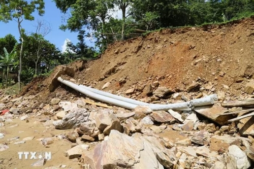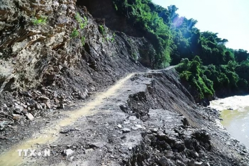 Đường dân sinh bị sạt lở khiến các bản Xốp Kho, Na Kho, Na Ngân nằm giữa đại ngàn Pù Huống bị cô lập hoàn toàn. (Ảnh: Xuân Tiến/ TTXVN)