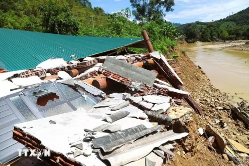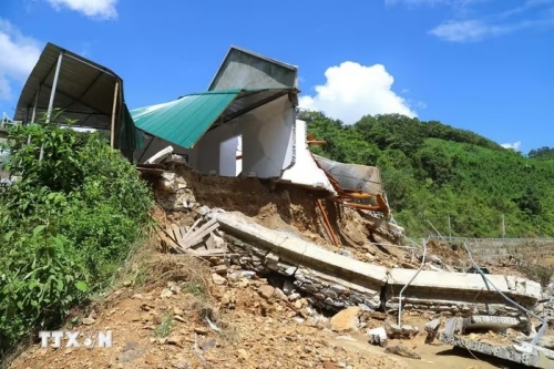 Một ngôi nhà bị lũ cuốn trôi, đổ sập hoàn toàn xuống suối Nậm Ngân, phần còn lại của ngôi nhà nằm cheo leo bên vách sạt lở. (Ảnh: Xuân Tiến/ TTXVN)