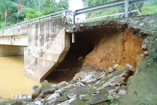 Cầu Noóng Mò (Km70 +912) bắc qua khe Hạng, quốc lộ 48C bị lũ lớn dâng cao, chảy xiết gây xói mòn tạo thành hàm ếch tại chân và mố cầu, nguy cơ đổ sập mặt đường rất cao. (Ảnh: Xuân Tiến/TTXVN)