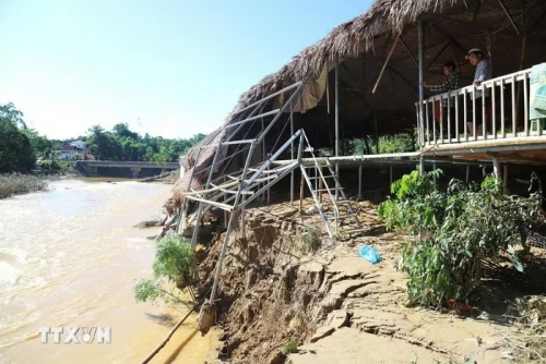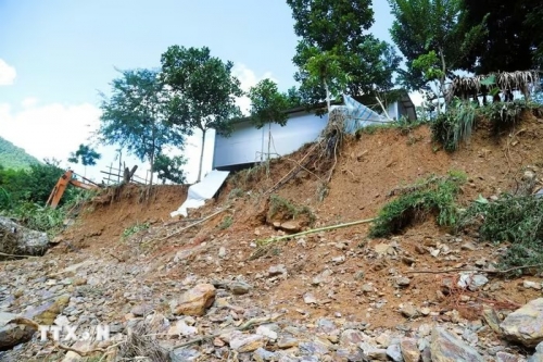 Ngôi nhà có nguy cơ đổ sập xuống suối nằm cheo leo bên bờ sạt lở gần cầu Xốp Chảng. (Ảnh: Xuân Tiến/TTXVN)