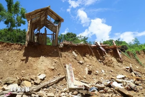 Dù ở vị trí trên cao và cách xa mép vực của suối Nậm Ngân, nhưng do mức độ tàn phá khủng khiếp của lũ ống, lũ quét đã khiến ngôi nhà bị sập đổ. (Ảnh: Xuân Tiến/TTXVN)