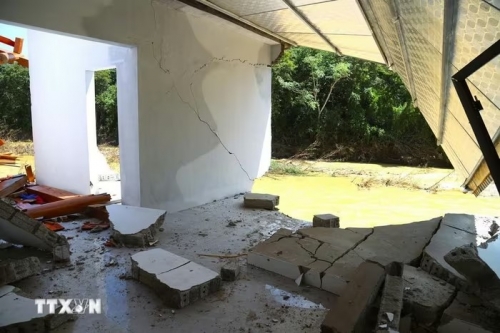 Những bức tường còn sót lại chằng chịt vết nứt toác trong ngôi nhà bị đổ sập xuống suối. (Ảnh: Xuân Tiến/TTXVN)
