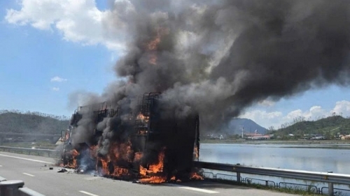 Nghệ An: Xe tải bốc cháy ngùn ngụt trên cao tốc bắc-nam