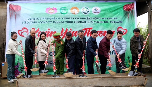 Đại diện Ủy ban Mặt trận Tổ quốc Việt Nam tỉnh Nghệ An, chính quyền địa phương, ban tổ chức chương trình và các nhà tài trợ làm lễ khởi công xây dựng nhà tình nghĩa cho hộ gia đình chị Cao Thị Nhàn trú tại xóm Tây Lợi, xã Minh Hợp, tỉnh Nghệ An |