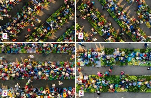 Nhìn từ trên cao, khu chợ hiện lên với những gian hàng vuông vức, gọn gàng và sạch sẽ. Người bán được bố trí chỗ ngồi theo từng khu vực riêng tùy vào loại thực phẩm, từ trái cây, rau củ, đến các loại thủy hải sản - tạo nên khung cảnh ngăn nắp hiếm thấy ở một khu chợ quê. |