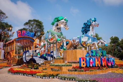 Bên cạnh "Xích mã Thăng Long" là "Song mã tương phùng". Cặp ngựa kéo xe hoa được thi công trên khung thép chắc chắn, xung quanh là cụm hoa nhiều màu sắc. Ảnh: Lê Tuấn/Thổ Địa Phú Yên. |