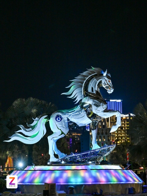 Đà Nẵng nổi lên như một trong những "điểm nóng" sáng tạo linh vật ngựa dịp Bính Ngọ 2026 với bộ đôi tác phẩm mang tên "Kim Mã Hợp Nhất" và "Kim Mã 4.0". Trong đó, linh vật ngựa công nghệ đặt tại khu vực phía Nam cầu Rồng, được thiết kế theo phong cách hiện đại với đường nét gọn gàng, khỏe khoắn, cao hơn 4 m, tượng trưng cho hình ảnh Đà Nẵng của tương lai, năng động, sáng tạo và bứt phá. Ảnh: Fan Mẫn. |