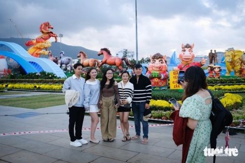 Người dân tham quan, ghi lại hình ảnh kỷ niệm bên cụm linh vật ngựa Tết - Ảnh: TẤN LỰC |