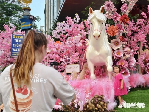 Du khách check-in linh vật ngựa vàng - Ảnh: TRẦN HOÀI |