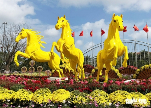 Bộ ba ngựa vàng óng ánh trong ánh nắng bên cạnh vườn mai vàng làm cho khu vực trung tâm quảng trường nổi bật.