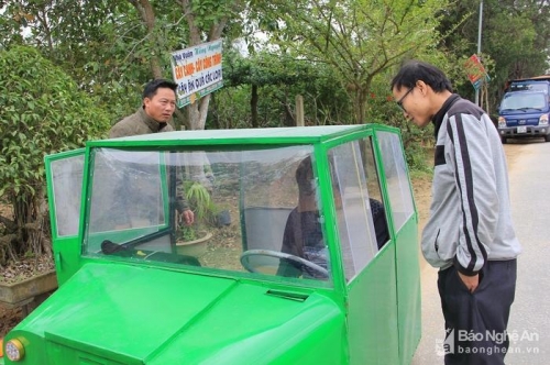 Chiếc 'ô tô mi ni' tự chế từ chiếc xe đạp điện cũ thuộc sở hữu của anh Nguyễn Văn Trường (38 tuổi, xóm Kim Chi, xã Nghi Ân, thành phố Vinh, Nghệ An). Anh Trường hiện là chủ một cửa hàng tạp hóa nhỏ. Chiếc xe được một mình anh lắp ráp trong vòng 2 tháng với mục đích đưa con đi học. Ảnh: TT. |