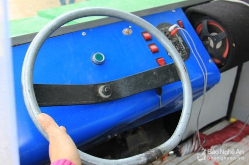 Ngoài một số bộ phận được lấy lại từ xe đạp điện cũ, các bộ phận còn lại hầu như tự anh chế từ các loại phế liệu. Vô-lăng được làm từ khung thép uốn cong và hàn lại một cách thô sơ. Ảnh: TT. |
