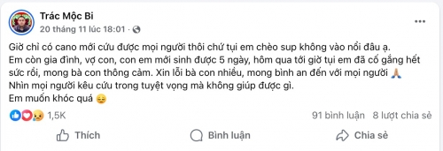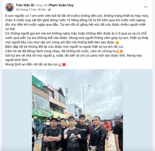 Tụi em đã cố gắng hết sức để cứu được nhiều người nhất có thể. Có những người gọi em mà em không nghe máy hoặc không đến được là vì ở quá xa và có chỗ nước quá siết, tụi em không thể vào được. Mong mọi người thông cảm giúp tụi em, thiệt sự thấy mọi người kêu cứu như vậy em cũng xót lắm mà không biết làm sao được.