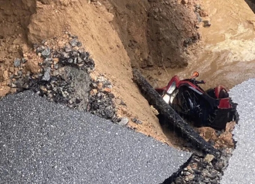 Chiếc xe máy bị rơi xuống hố do xói lở gây ra |
