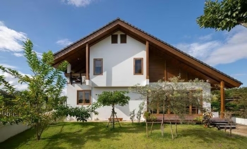 Mái dốc kết hợp trần hiên ốp gỗ tạo lớp vỏ mềm mại cho mặt tiền. Ảnh: Rungkit Charoenwat |