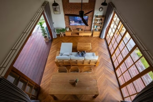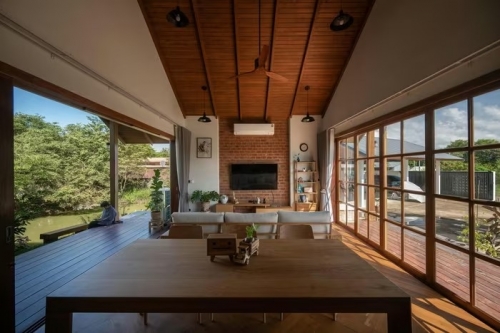 Cửa kính khung gỗ mở rộng toàn bộ không gian sinh hoạt chung. Ảnh: Rungkit Charoenwat |
