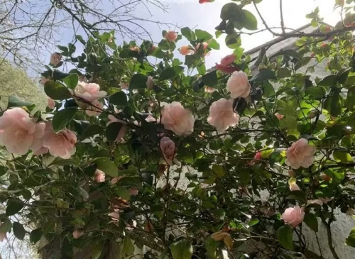 Góc vườn rực rỡ với hoa trà màu hồng phấn. Ảnh: FB Tran Le Vi Levi |