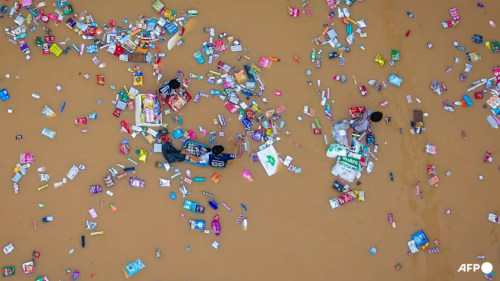Bức ảnh chụp từ trên không vào ngày 26 tháng 11 năm 2025 cho thấy mọi người lội qua vùng nước lũ ở Hat Yai, tỉnh Songkhla, miền nam Thái Lan, xung quanh là các sản phẩm nổi lềnh bềnh từ một siêu thị. (Ảnh: AFP) |