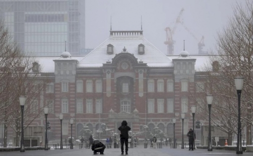 Nhà ga JR Tokyo (cửa Marunouchi) với lớp tuyết phủ dày trên mái. Ảnh chụp lúc 8 giờ 24 phút sáng ngày 8-2. Ảnh: Yomiuri |