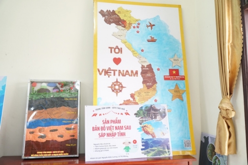Sản phẩm bản đồ Việt Nam sau sáp nhập tỉnh của Trung tâm GDNN-GDTX Thái Hòa. Ảnh: Hồ Lài |