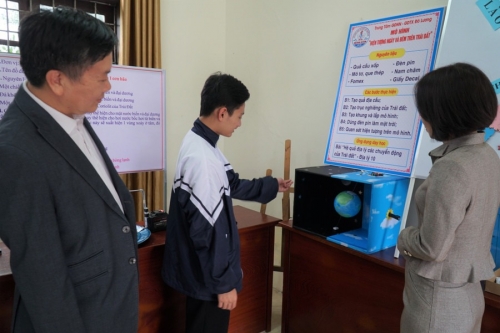 Học sinh Trung tâm GDNN-GDTX Quỳnh Lưu giới thiệu về đồ dùng dạy học môn Địa lý do thầy cô sáng tạo và áp dụng trên lớp. Ảnh: Hồ Lài |