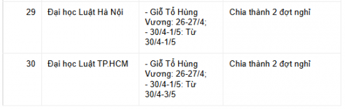 Ngược lại, vẫn có những cơ sở đào tạo giữ lịch học xen kẽ, cho sinh viên nghỉ hai đợt và học bình thường trong các ngày 28-29/4 như trường Đại học Công nghệ Đông Á, trường Đại học Hà Nội, trường Đại học Công nghiệp TP.HCM…