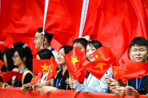 Sinh viên Trung Quốc tại Việt Nam cầm quốc kỳ hai nước chờ đón Tổng Bí thư, Chủ tịch nước Trung Quốc Tập Cận Bình sáng 14-4 tại Hà Nội - Ảnh: NAM TRẦN |