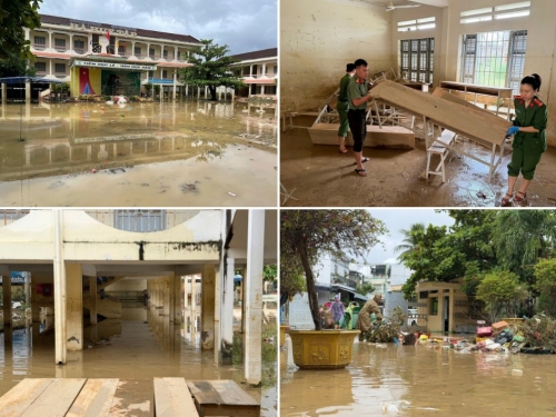 Trường THPT Hà Huy Tập (phường Tây Nha Trang, Khánh Hòa) ngổn ngang sau lũ. Rác thải ứ đọng trong sân trường, các phòng học ngập bùn non đặc quánh. Đoàn Thanh niên Công an tỉnh Khánh hòa và công an 64 xã, phường đã ra quân hỗ trợ dọn dẹp trường trong các ngày 21-23/11. Ảnh: Tuổi trẻ Công an Khánh Hòa. |