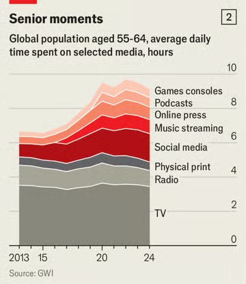 Thời gian người lớn tuổi ngồi trước màn hình đang tăng vọt từ năm 2013 đến nay. Ảnh: The Economist. |