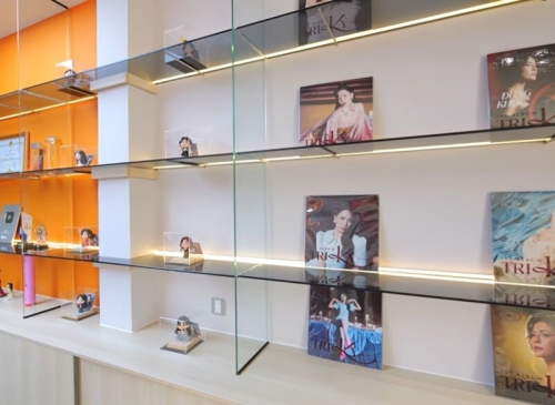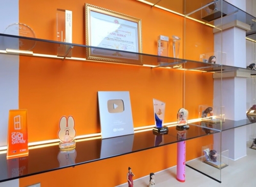 Những chiếc kệ kính chạy dài là nơi lưu giữ "gia tài" âm nhạc đồ sộ với hàng loạt giải thưởng danh giá, Nút bạc YouTube và những album kỷ niệm chặng đường 10 năm ca hát đầy thăng trầm. |