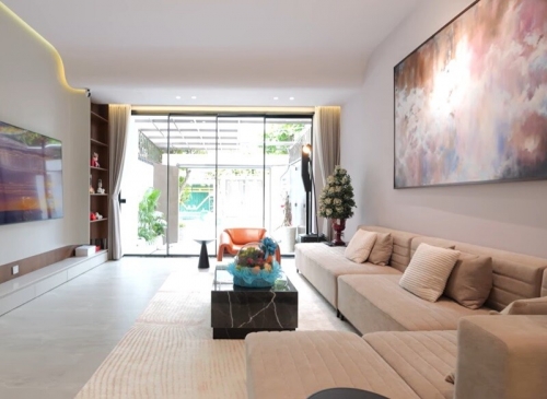 Căn nhà phố hiện đại, ấm cúng với diện tích 120m2. Cô chia sẻ trong chương trình Nhà F: "Lúc mà em mua căn này em đâu có quan tâm gì đến diện tích đâu. Em thích là em mua à..." Cơ ngơi có khoảng sân vườn phía trước, mái che có thể mở ra khi muốn tắm nắng. |