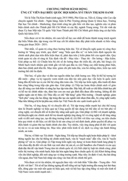 PGS-TS Trần Thị Kim Oanh cam kết nếu trở thành đại biểu Quốc hội, bà sẽ tập trung nghiên cứu và kiến nghị các chính sách học phí hợp lý, đi kèm cơ chế hỗ trợ tài chính nhân văn nhằm đảm bảo công bằng giáo dục, giúp học sinh vùng sâu, vùng xa và gia đình khó khăn đều có cơ hội tiếp cận môi trường học tập chất lượng.