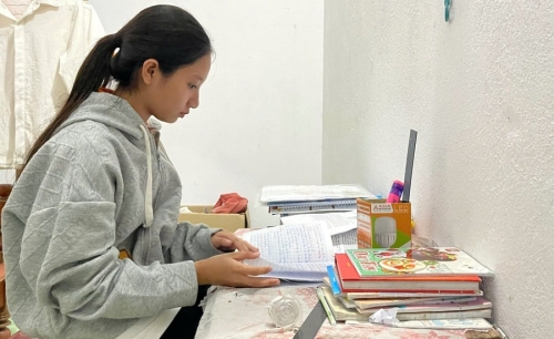 Ban đêm, trong căn phòng nhỏ đơn sơ, Mến ngồi cặm cụi bên chiếc bàn gỗ cũ, ánh đèn vàng hắt xuống từng trang vở học tiếng Nhật. Những nét chữ nghiêng ngả nhưng đầy cố gắng. Em nhẩm đi nhẩm lại từng từ vựng, phát âm khe khẽ như sợ làm ông bà và mẹ thức giấc.