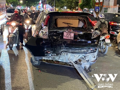Một xe ô tô được cho là không kiểm soát được tốc độ đã va chạm với một ô tô khác và 3 xe máy đang lưu thông trên đường.