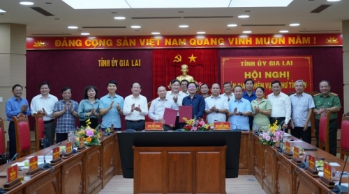 Ông Hồ Quốc Dũng và ông Thái Đại Ngọc – Ủy viên Trung ương Đảng, tân Bí thư Tỉnh ủy Gia Lai – đồng chủ trì và ký biên bản bàn giao nhiệm vụ, liên quan đến công tác tổ chức, cán bộ, phát triển kinh tế - xã hội, quốc phòng - an ninh và các nhiệm vụ chính trị trọng tâm của địa phương.