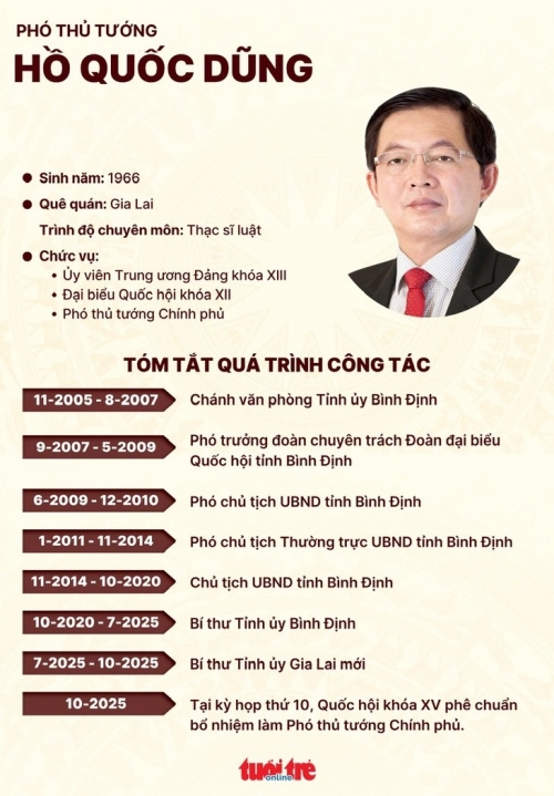 Ông Hồ Quốc Dũng sinh năm 1966, quê Gia Lai. Ông Dũng trước đó là Bí thư Tỉnh ủy Gia Lai mới, Bí thư Tỉnh ủy Bình Định cũ.