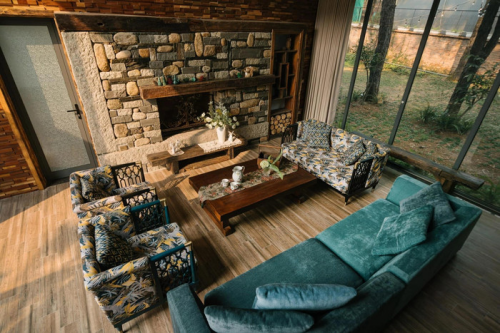 Phòng khách được thiết kế ấm cúng với lò sưởi ốp đá tự nhiên, tường ốp gỗ sa mộc thơm ngát, decor theo phong cách vintage châu Âu. Bộ sofa bọc vải nhung màu xanh lá cây là nơi lý tưởng để gia đình và du khách quây quần trò chuyện |