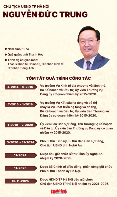 Trước đó, ngày 10-11, Thành ủy Hà Nội đã tổ chức hội nghị công bố quyết định của Bộ Chính trị về công tác cán bộ. Tại hội nghị, ông Nguyễn Quang Dương - Phó trưởng Ban Tổ chức Trung ương - đã đọc quyết định của Bộ Chính trị về công tác cán bộ. Theo quyết định số 2509, ông Nguyễn Đức Trung - Bí thư Tỉnh ủy Nghệ An - được điều động, chỉ định giữ chức vụ Phó bí thư Thành ủy Hà Nội khóa XVIII nhiệm kỳ 2025-2030. Bộ Chính trị quyết định ông Nguyễn Đức Trung thôi giữ chức Bí thư Tỉnh ủy Nghệ An; điều động, phân công, chỉ định ông tham gia Ban Chấp hành, Ban Thường vụ và giữ chức Phó bí thư Thành ủy Hà Nội khóa XVIII, nhiệm kỳ 2025-2030. |