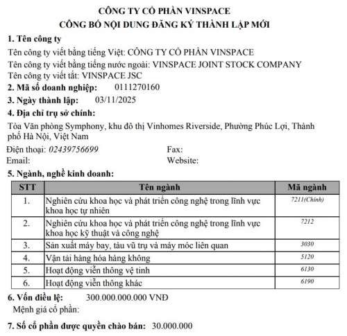 Trên cổng thông tin quốc gia về đăng ký doanh nghiệp, Công ty cổ phần Vinspace được thành lập vào 3/11/2025, trụ sở tại tòa văn phòng Symphony, khu đô thị Vinhomes Riverside, phường Phúc Lợi, TP. Hà Nội.