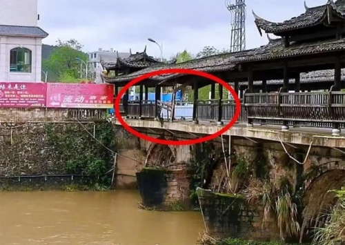 Vị trí ôtô đâm gãy trụ và lan can cầu trước khi rơi xuống sông. Ảnh: Sohu |