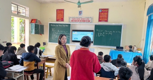 Giáo viên giảng dạy học sinh tại Trường Phổ thông dân tộc bán trú - Trung học cơ sở Chiêu Lưu (Nghệ An) được đầu tư bảng trượt 3 tấm là loại bảng gồm 3 tấm: hai tấm bảng hai bên được thiết kế cố định và một tấm bảng ở giữa có thể di chuyển được. Loại bảng này có ưu điểm là tăng không gian viết, mở rộng kết hợp với tivi, màn hình tương tác, tối ưu không gian phòng học. Ảnh: Quốc Huy |